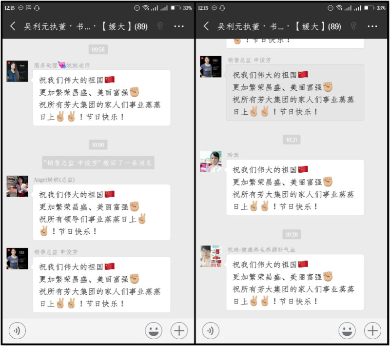 国庆佳节到来,名人名师也没有忘记吴利元执董书友会的各位。通过微信,出书大师携名人名师全体对吴利元执董书友会全体表达了祝福之情。在早晨阳光明媚的时候,名人名师的服务助理首先在微信群里发了国庆祝福“祝我们伟大的祖国更加繁荣昌盛、美丽富强;祝所有芳大集团的家人们事业蒸蒸日上!节日快乐!”而后很快就有人做出了热情的回应,也在微信群里发送了同样的祝福,然后名人名师的销售总监也作出了同样的回应“祝我们伟大的祖国更加繁荣昌盛、美丽富强;祝所有芳大集团的家人们事业蒸蒸日上!节日快乐!”之后,“玲珑”和“杭珠-健康养生养颜补气血”也回复了“祝我们伟大的祖国更加繁荣昌盛、美丽富强;祝所有芳大集团的家人们事业蒸蒸日上!节日快乐!”。