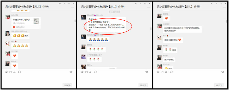 吴小芳也不例外,创业初期常常废寝忘食的工作,团队的核心更要承受巨大的压力。即使这样,仍不忘关心他人,对别人关怀备至。到今天,可算是已经旗开得胜、名利双收,仍坚持忘我的付出,与自己的书友每日互动,即使嗓子沙哑也坚持到底。因为她明白,书友的认可是自己前进的动力,书友的支持是自己成功的基石,所以即使在功成名就之时也不忘书友们的默默追随。常怀一颗感恩之心,常省一日行为之过,才能行正道,尽人事,安身立命。