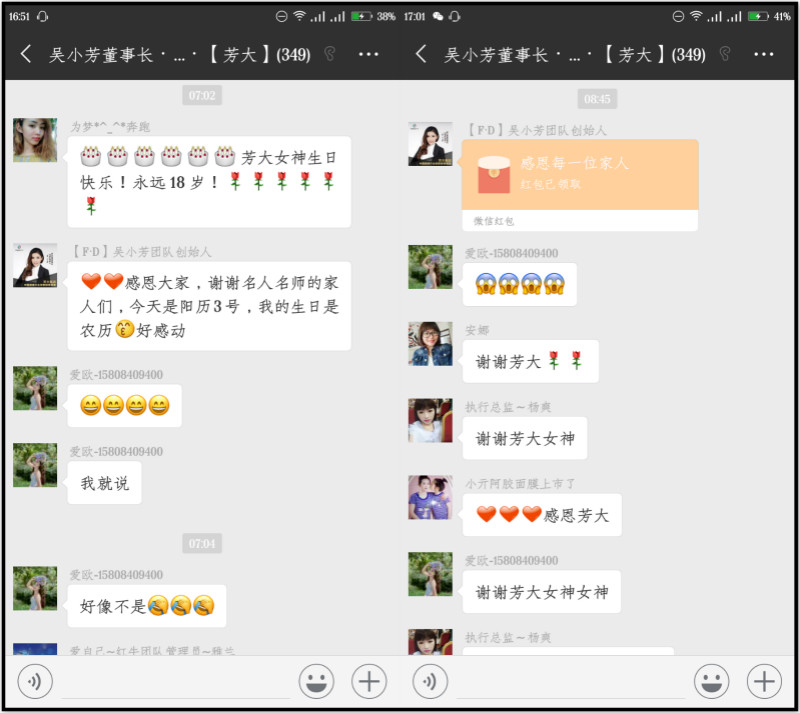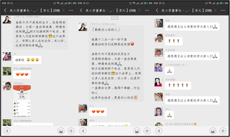 今天发生了一件温暖的乌龙事件,在芳大集团的书友群里,代理们纷纷对创始人吴小芳送上生日祝福,但是今天却不是创始人吴小芳的生日。原来她的生日是农历的十月初三,虽然日子错了 ,但着实让人倍感欣慰。