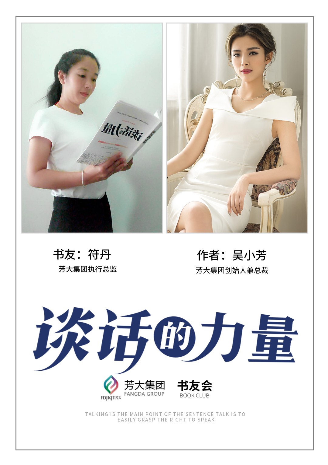 在芳大集团,符丹获得的个人成长还不止这些。为了更好的进行团队管理和代理销售,芳大集团的大咖们向符丹推荐了一本书,《谈话的力量》。这本书是由芳大集团创始人吴利元和吴小芳交由出书大师网全权出版的。拿到这本书的符丹如获至宝,时刻把它带在身边,拿在手上,反复地把这本书拿出来翻阅观读。每过一段时间,再度拿出来阅读时,符丹都会有些新的心得体会。
