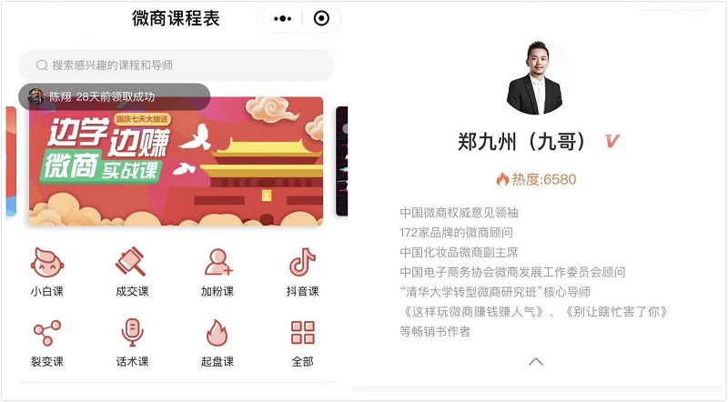 作为微商界的领军人物,落地荟创始人,中国微商权威意见领袖,郑九洲(九哥)发现还有许多人正在为怎样做微商烦恼,一直在询问做微商的诀窍和方法,希望找到一条合适的微商发展之道。于是,为了解决这些问题,九哥义不容辞加入《微商课程表》,亲自上阵录了两节课,向大家分享了自己多年来经营微商的经验和技巧,可谓是干货满满。