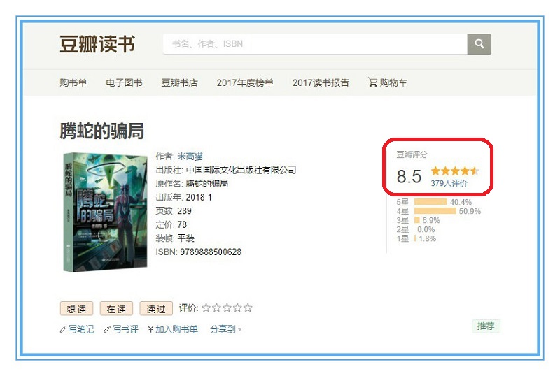 豆瓣读书的打分系统极具客观性,理论上大家看到的评分都是每一位网友一个一个打出来的,都是自己真实阅读体验的体现。而且习惯在豆瓣阅读上打分的观众往往阅读储备量也相对较高,对书籍品质也相对更挑剔,一般打出的分数都低于其他阅读平台,具有较为真实的参考价值。《腾蛇的骗局》能够摘取8.5的高分,是其优质内容的综合表现,十分得难能可贵。