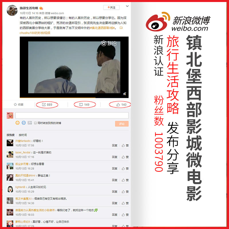 米高猫先生自编自导的微电影,最近再次迎来了关注的高峰。自从上线之后,就有很多影迷留言评论,一时间好评如潮。出书大师更是第一时间为此做了宣传,旗下的网媒公司的合作伙伴,拥有上百万粉丝的博主旅行生活攻略亲自转发分享,短短的时间内,转发量就达到了889,评论数和点赞量也分别达到了149和140。