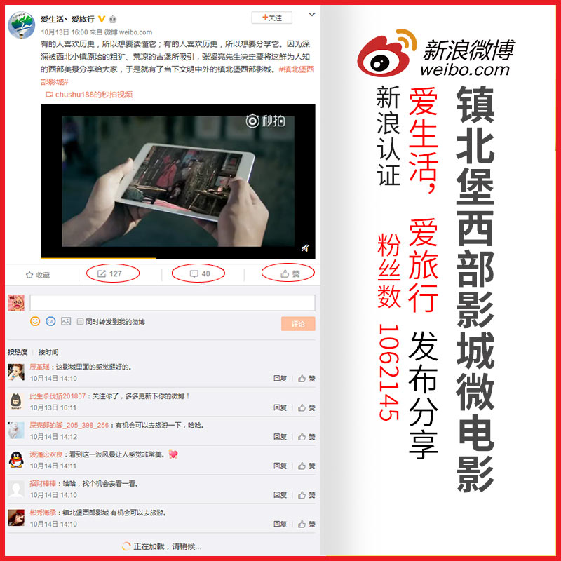 米高猫编导“镇北堡西部影城微电影”上线之后,出书大师充分利用新媒体促进这部微电影的传播,在网络上取得了很好的反响。新浪百万+粉丝的博主纷纷转发推荐,出书大师旗下网媒合作伙伴,人气博主爱生活、爱旅行拥有106万以上的微博粉丝,拥有夯实的人气基础,它的推荐使得米高猫先生编导的“镇北堡西部影城微电影”拥有更高的曝光率和传播热度,转发伊始,迅速有40条的评论和127的转发量,网友都表示此部微电影展现的风景让人神往,有机会去看一看。