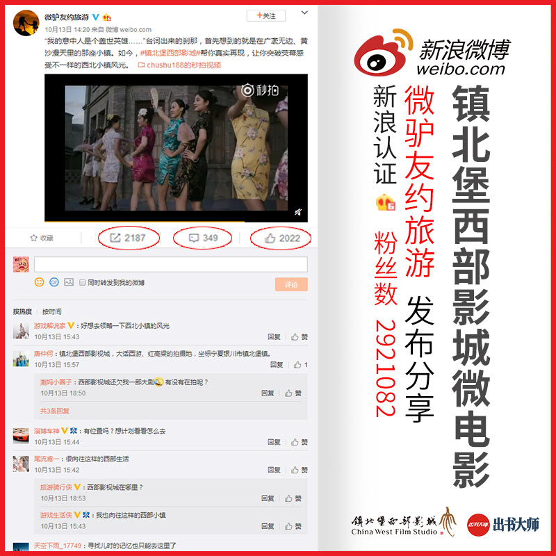 出书大师旗下网媒合作伙伴,拥有290万粉丝的著名微博大V“微驴友约旅游”,在自己微博上分享了这部微电影。哪里会想到,这座藏身于西北荒漠之中的古堡竟让粉丝网友们直接炸开了锅。在短短时间内在网友们的持续点击下,登上了热搜榜。点赞量更是达到了2022次,转发量也不遑多让,达到了2187多次。微博底下的留言评论区更是让人慨叹不已,大家纷纷感叹道:“ 镇北堡 ——心中理想的旅游胜地,纵是千山万水,也要去一睹你的风采。”