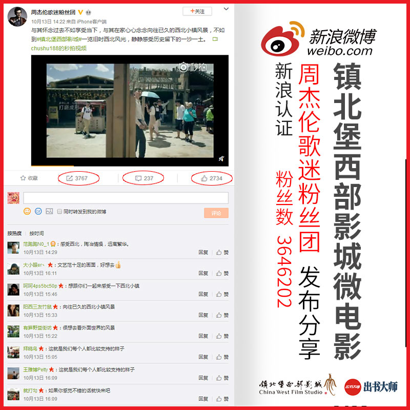 出书大师网旗下重要网媒合作伙伴、拥有364万+粉丝的微著名博大V“周杰伦歌迷粉丝团”也加入分享热潮。它的加入就如一石激起千层浪,使得这股热潮达到了一个顶点。在短短的时间内,转发量就迅速上涨达到3767次,推广覆盖范围十分广泛。除此之外,点赞数也不甘示弱,达到了2734个,评论区也互动频繁,网友们毫不吝啬的表达了对于这则微电影、对于镇北堡的喜爱之情,纷纷留下好评。镇北堡的影响力可见一斑。