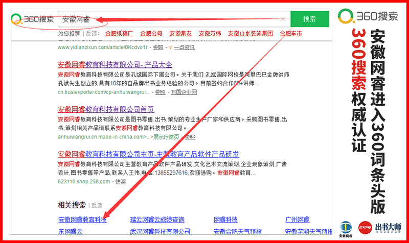 近日,安徽网睿教育科技有限公司更是进入360词条头版,获360搜索认证。