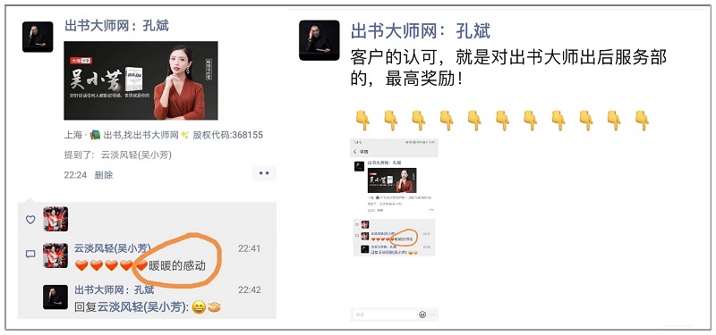 近日,出书大师网此举暖心的出后服务便受到了芳大集团董事长吴小芳女士赞誉,对其自品牌人物海报赞叹不已。
