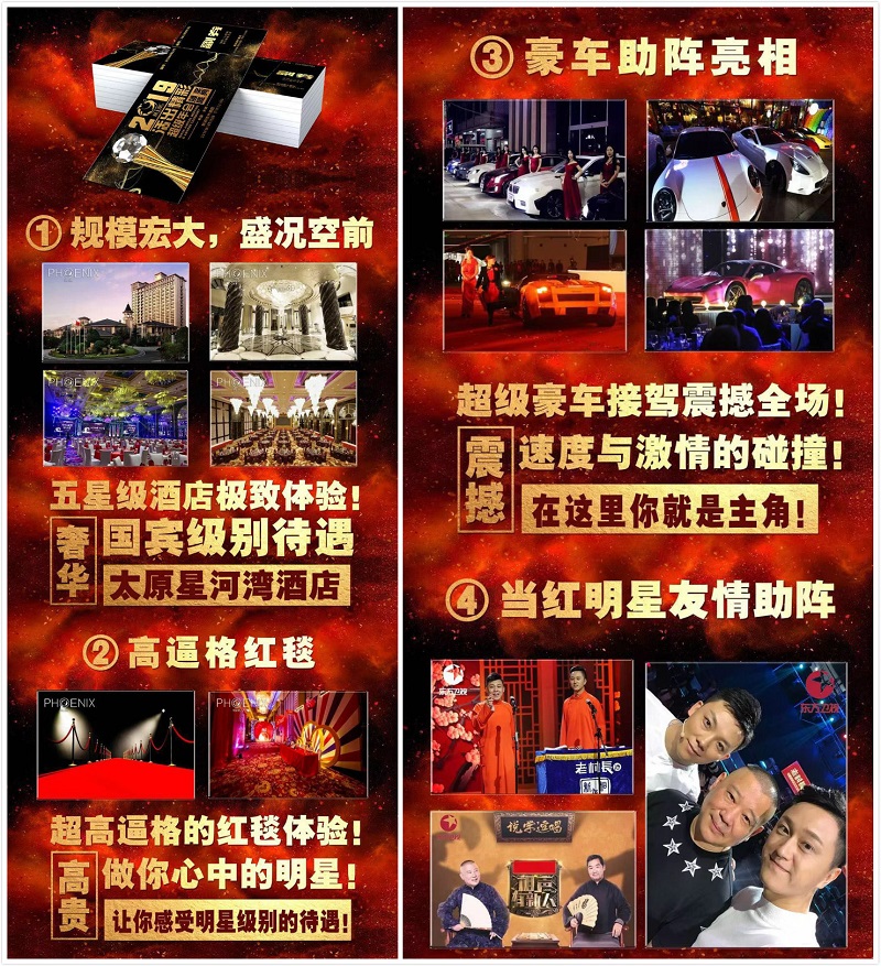 1月10日,伴随着凰上凰超级年会暨颁奖盛典在太原星河湾大酒店隆重举行,其2019年发展新篇章也缓缓拉开序幕。各位资深大咖、集团精英、行业领导、演艺明星欢聚一堂,共度联欢,一同享受这场超级嘉年华带来的饕餮盛宴。在众多现场观众的热烈支持之下,火爆的气氛迅速点燃全场,尽显新年新气象。