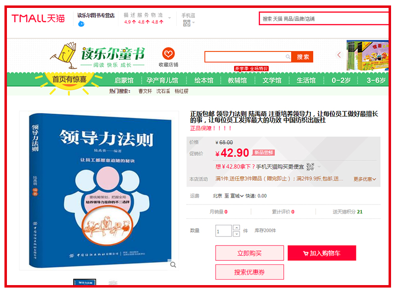 据出书大师网最新消息,《领导力法则》一书在在完成策划出版工作之后,目前已全面上架天猫、京东和1号店等权威网络销售平台,相信在出书大师网的联动推广下,此书定能给大家带来不一样的“领导力法则”全解。