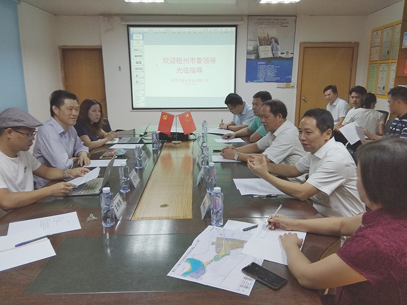 10月19日,广西梧州市委书记全桂寿率政府考察团一行5人,来到广东东莞金旺食品有限公司考察工作,梧州市委副秘书长邱振宇、藤县县委书记黄东明等陪同参观考察,金旺食品公司董事长陈瑞武热烈欢迎考察团一行。