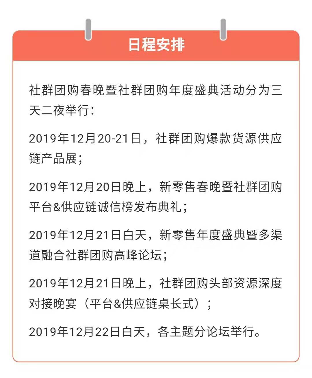 社群团购行业最大的行业盛典——社群团购春晚暨社群团购平台&供应链诚信榜发布盛典将于2019年12月20日在杭州举办。来自全国的社群团购界的5000名头部平台和供应链伙伴受邀出席,共同见证平台&供应链诚信榜的发布。本次活动将持续三天,将深度学习与链接资源