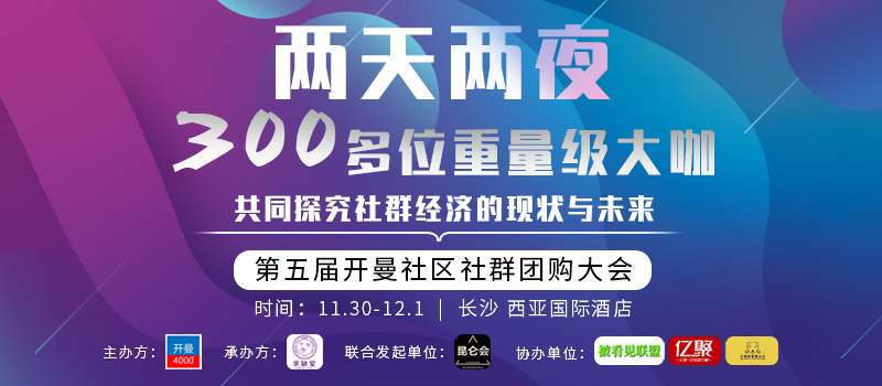 第五届开曼·中国社区社群大会将于2019年11月30日至12月1日在长沙西雅国际大酒店举办,邀请300多位重量级社区团购、社群团购平台方创始人和招商负责人。两天两夜,深度探究社群经济的现状与未来,联手构建强大的中国社群玩家的命运共同体。