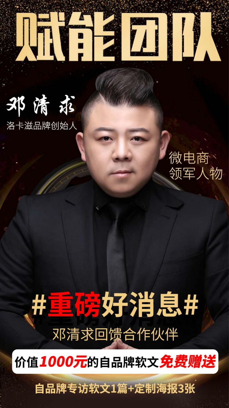 但是,邓清求在收获事业的同时,并没有缺少对IP品牌价值的重要性的忽视,他与出书大师网合作,开展相关的自品牌塑造与维护传播,同时收获了不错的效果。在自身获得了影响力的同时,邓清求也希望可以赋能给身边的合作伙伴和朋友们,所以他将送出100份价值1000元的个人IP品牌推广套餐(价值500元的个人IP软文+价值500元的个人宣传海报3张)感谢朋友们能够一如既往的继续支持和关注他。