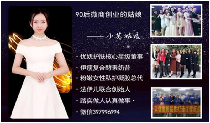 在2014年6月,除了她满18岁的重要日子,也是她第一次接触微商的日子,18岁的时她借了1264元开始她的微商事业,很多人都会猜想到在这之后,她就一帆风顺的在微商界站稳脚跟,事与愿违的是,在做微商没多久她就放下微商去参加其他的工作,在参加工作的过程她发现,做微商的时候还能每个月给他提供一部分的零花钱,这时候就让她对微商改变了看法,她认为微商是一片海,所以就毅然决然的在2016年3月5日这天辞去4500元的工作,决定把微商当做全职来做,功夫不负有心人,在2016年年底成功买了自己的车,2017年1月在威海买了自己的房子,成功的和许多90后形成鲜明对比。