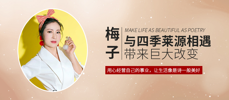 这个情况,直到梅子与四季莱源相遇之后,才画上了一个句号。2014年,吕小姐给了梅子一瓶四季莱源的体验装,这让梅子对四季莱源有了一丝兴趣,慢慢的梅子就成为了四季莱源的忠实粉丝,就这样当了VIP客户半年后、梅子决定升级成为一级代理传播四季莱源,让更多人受益。随着产品销量越来越好,半年之后、梅子果断升级成为了总代理。
