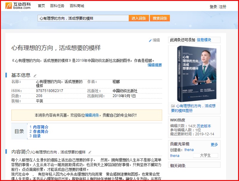 众所周知,百科是一部有着平等、协作、分享、自由理念的网络百科全书,致力于为每一个互联网用户创造一个涵盖所有领域知识、服务的中文知识性平台。而深受大众欢迎的百度、360、互动三家百科平台也有着近乎严苛的审核标准,通俗而言,只有真正贴近真理、真正被大众认可的书籍才能成功被三家百科认可。