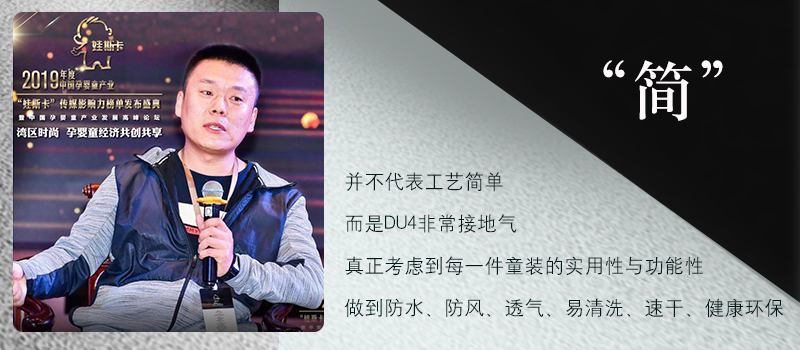 DU4是达方自己的品牌,寓意很简单,DU来自德语,是“你”的意思,4是一年四季,所以DU4就是指一年四季所穿的衣服,属于简欧风格。相对于传统颜色饱和度高、采用大面积夸张图案的童装来说,它的设计简洁大方,而这个“简”并不代表工艺简单,而是说DU4非常接地气,因为它是真正考虑到每一件童装的实用性与功能性的牌子,做到防水、防风、透气、易清洗、速干、健康环保。