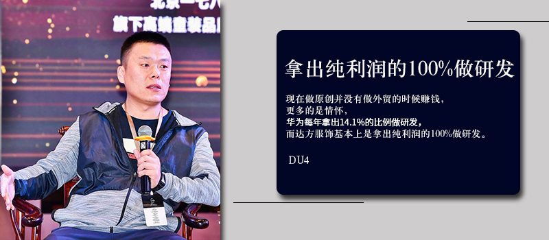 从帮别人代加工到现在做原创有了自己的品牌“DU4”,大家都觉得樊庆兵做大了,而他自己却坦言:现在做原创并没有做外贸的时候赚钱,更多的是情怀,华为每年拿出14.1%的比例做研发,而达方服饰基本上是拿出纯利润的100%做研发。