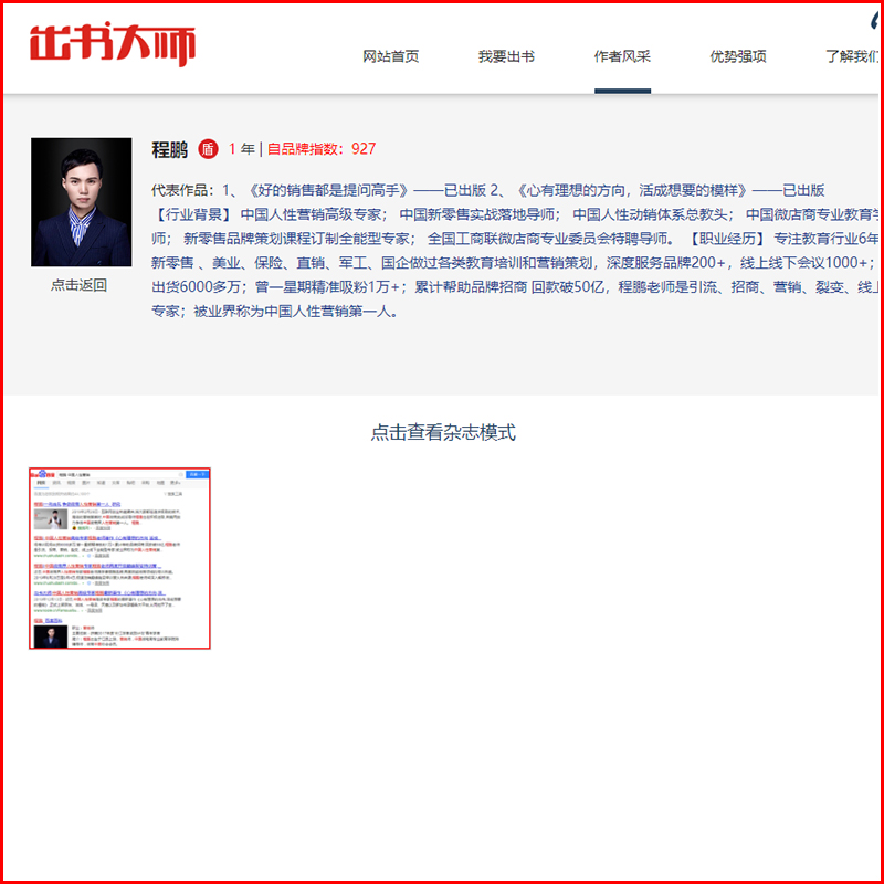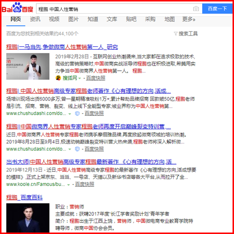 依托于出书大师网的核心网络推广资源以及出书大师网旗下众多网络媒体的连番报道,“程鹏”、“中国人性营销第一人”等词搜索频率极为频繁,只要在百度网一输入此类词汇,系列信息和新闻便会速占据了百度网首页,极大程度上提高了程鹏老师网其所属行业领域中的行业影响力,真正塑造专业话语权。