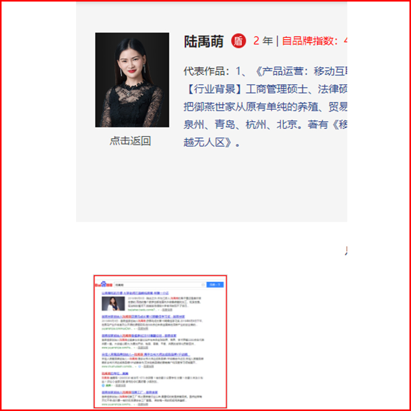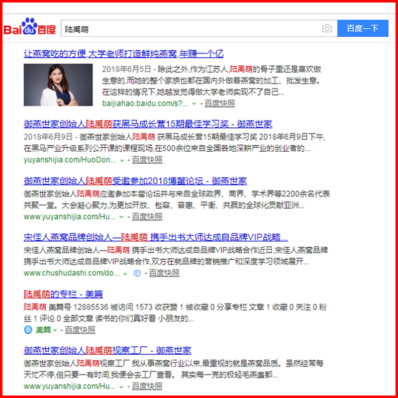 出书大师网以陆禹萌女士独有的文化内蕴为出发点,进一步深度挖掘宋佳人燕窝的品牌价值、实力、信誉、资源等优势点,利用庞大的社群推广、优质的书籍和全方位的出后服务助力陆禹萌缔造超强自品牌。当在全球最大中文搜索引擎百度搜索中输入“陆禹萌”名字时,其在百度首页信息尽显,著作、新闻、专栏应接不暇。