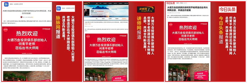近日,关于“大德万合投资俱乐部创始人何青平造访出书大师网总部,共谋合作新发展”的一则新闻,经出书大师网报道后,现已登上了各大网络新闻媒体的头条,成为社会各界热议的焦点。
