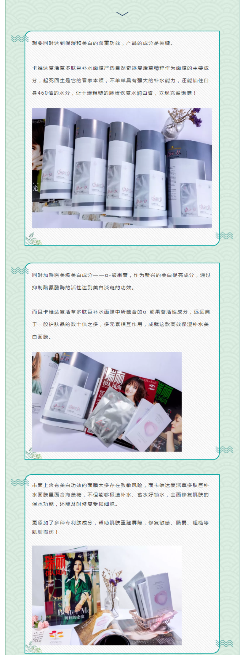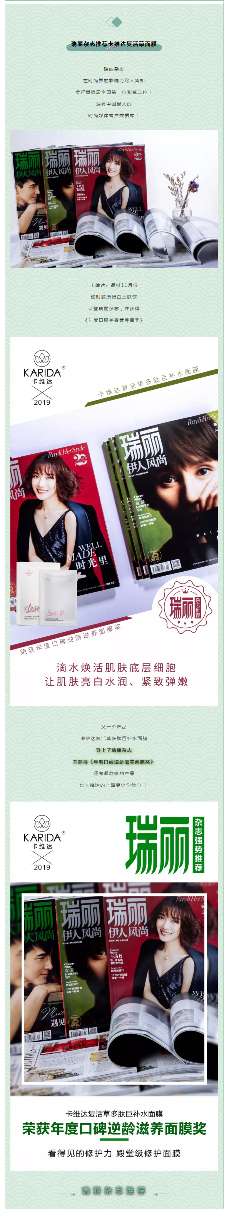 郭一凡:国货之光,卡维达又一产品【复活草460倍巨补水面膜】荣登瑞丽杂志!