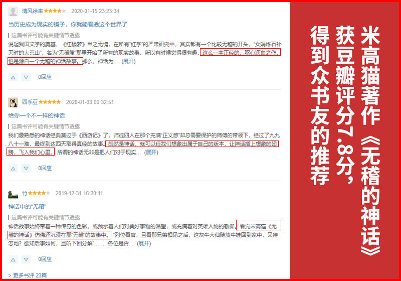 近日,由布克文化出版、宁夏华夏西部影视城有限公司董事长米高猫创作的著作《无稽的神话》获得豆瓣7.8分的好成绩,并且,也得到了众多豆瓣书友的热情推荐。