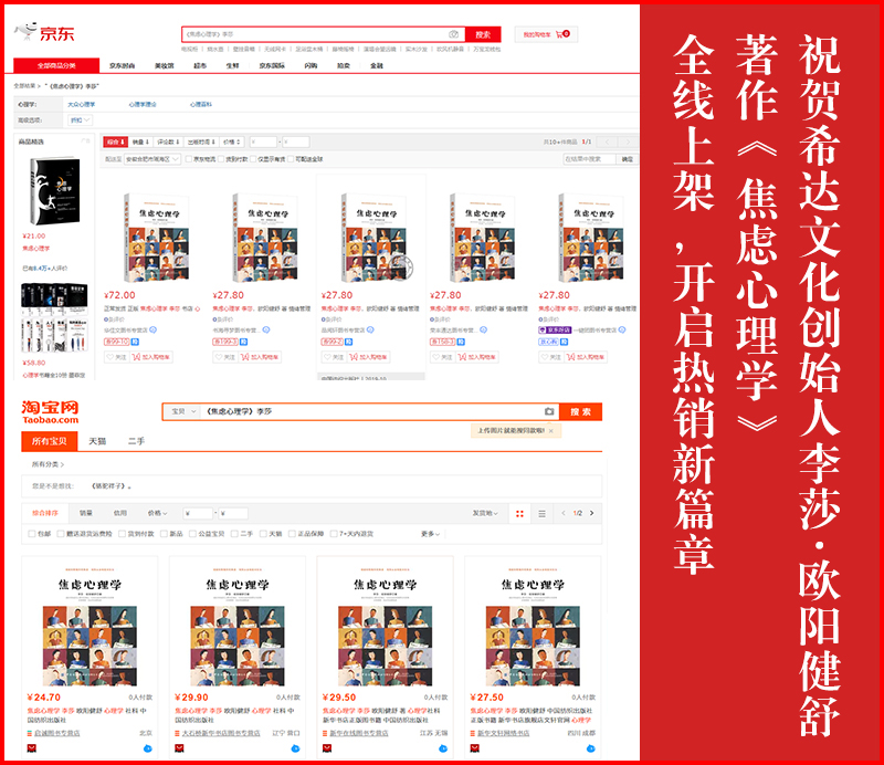 近日,由中国纺织出版社出版、希达文化创始人李莎老师与欧阳健舒老师共同创作的著作《焦虑心理学》,在京东、当当、淘宝以及一号店等平台全线上架。从而,开启了热销新篇章。