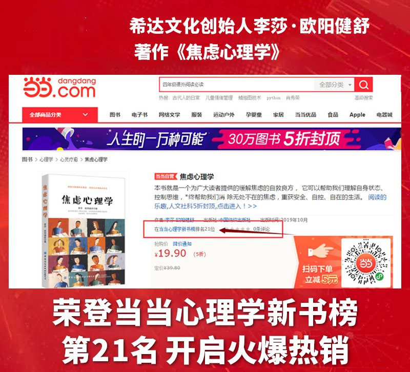 近日,由中国纺织出版社出版、希达文化创始人李莎老师与欧阳健舒老师共同创作的著作《焦虑心理学》,获得广大读者朋友们的关注与支持,喜获当当心理学新书榜第21名。