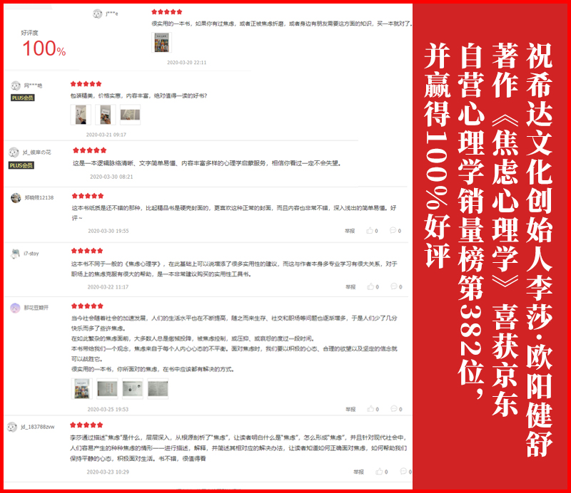近日,由中国纺织出版社出版、希达文化创始人李莎老师与欧阳健舒老师共同创作的著作《焦虑心理学》,喜获京东网自营心理学销量榜第382位。同时,还得到了读者朋友们的100%好评。