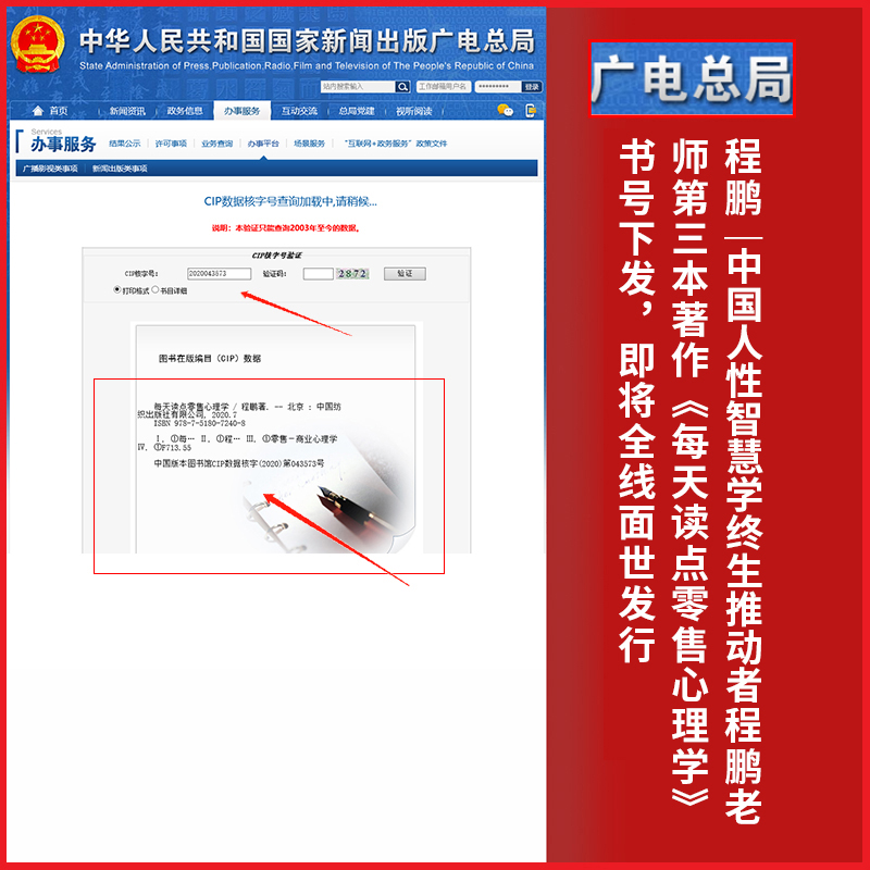 据悉,《每天读点零售心理学》是程鹏老师的第三本著作,在出书大师网的策划运筹之下,目前此书已正式取得CIP号和ISBN号,已全面进入出版印刷流程,不日将会全线发行,面向广大读者粉丝售卖。