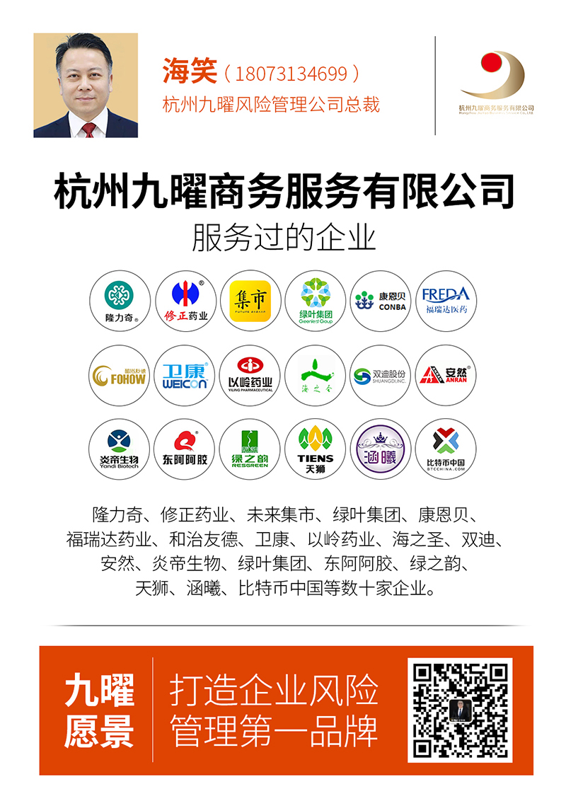九曜商务服务有限公司主要做事前风险防控,已服务过福瑞达、卫康、炎帝生物、绿之韵健康科技、华林酸碱平、绿叶科技、以岭药业、康恩贝、东阿阿胶、隆力奇、天狮、比特币中国等十多家企业,形成了成熟的企业合规运营风控系统。