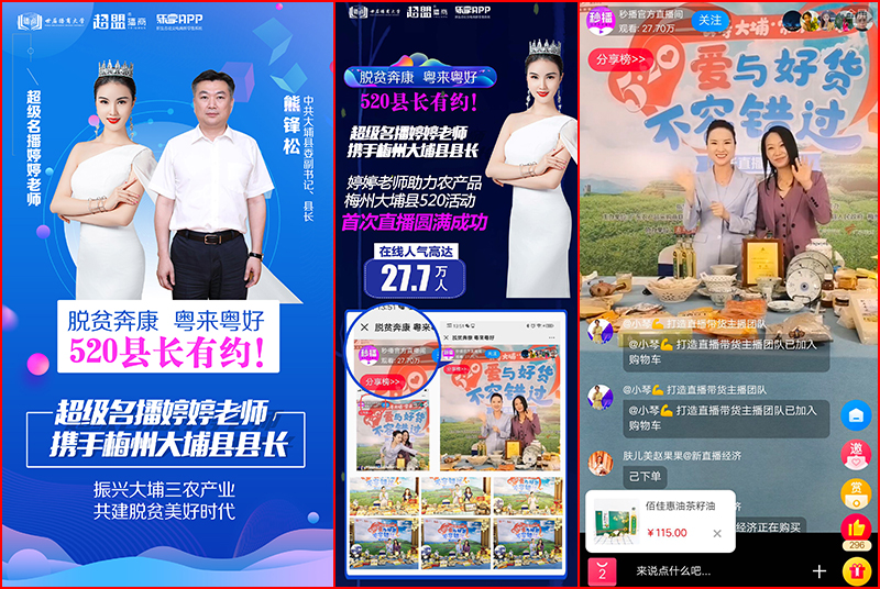 为了拉动后疫情时代下的消费新需求、振兴大埔三农产业、共建脱贫美好时代,5月20日上午9:30-15:00,大埔县县长熊锋松坐镇直播间直播荐珍品,而婷婷老师也现身直播间为活动助力。活动人气最高时在线围观人数直逼三十万,获得了圆满成功。