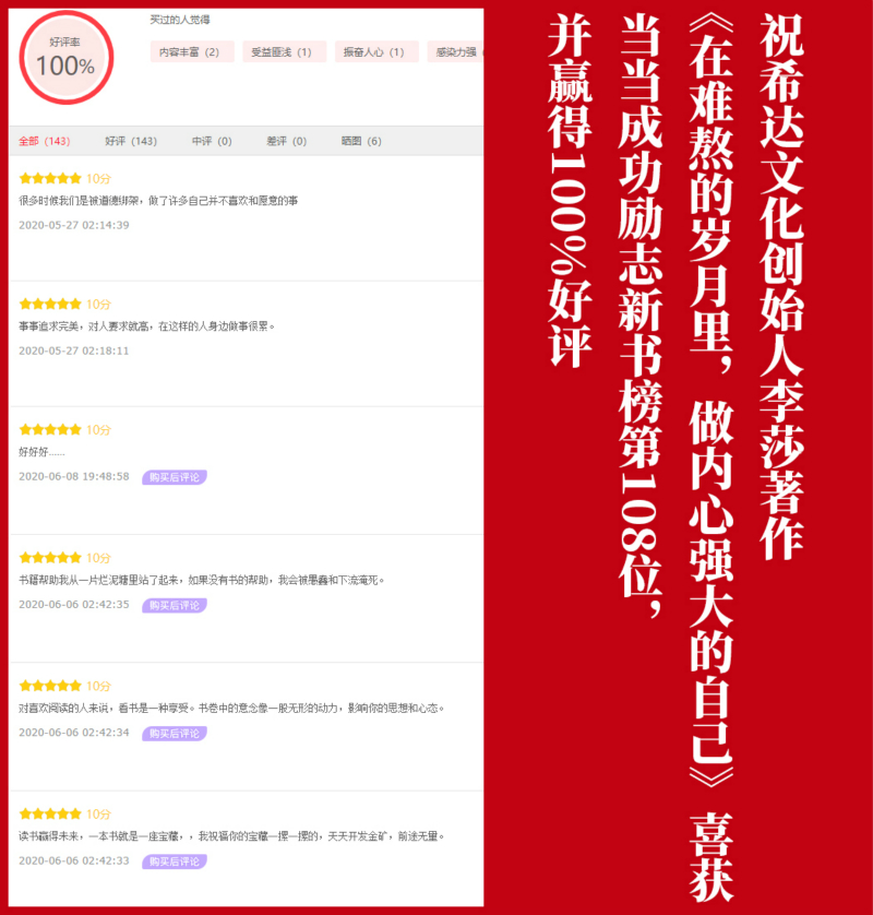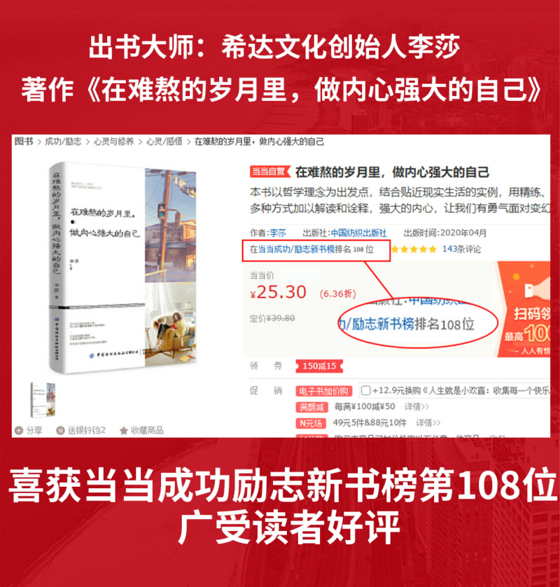 近日,由中国纺织出版社出版、希达文化创始人李莎老师创作的著作《在难熬的岁月里,做内心强大的自己》喜获当当网成功励志新书榜第108位,并广受读者朋友的好评。