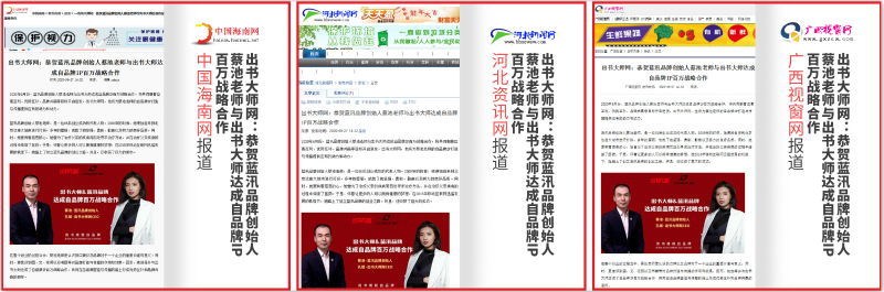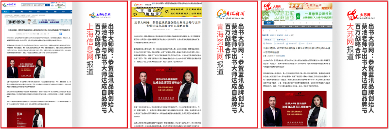 2020年6月份,蓝汛品牌创始人蔡池老师与出书大师达成自品牌IP百万战略合作,将共同朝着互惠互利、优势互补、品牌共赢等目标开启进发。出书大师网,也将为蔡池老师的自品牌IP打造与传播提供应有的助力和动力。