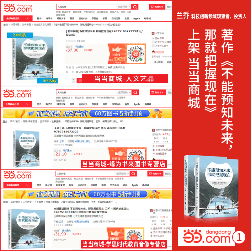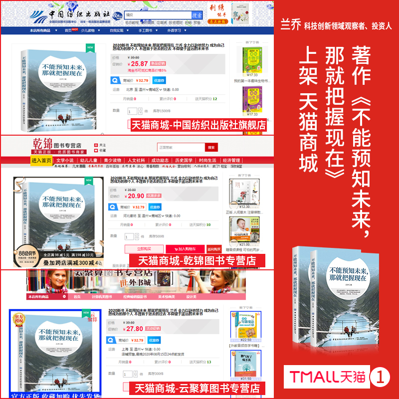 近日,由中国纺织出版社出版、出书大师网全权代理策划出版、兰乔老师创作的著作《不能预知未来,那就把握现在》正式上架京东、淘宝、当当、1号店以及新华书店等各大渠道,火爆热销中。