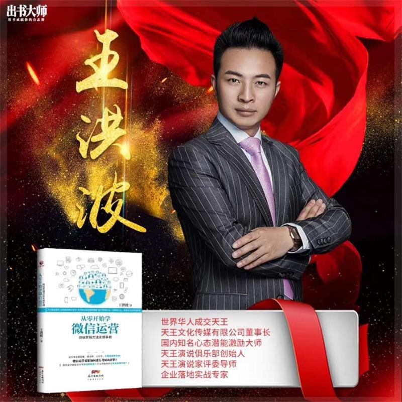 王洪波是天王集团董事长、天王文化传媒有限公司董事长、国内知名心态潜能激励大师,天王演说俱乐部创始人,王老师被各界成功人士称之为“世界华人成交天王”,成为连续多届“梦想中国”最受欢迎的讲师之一,也是为数不多被邀请去国外演讲的亚洲演说家。其著作《从零开始学运营》在全国各地受到众多微商创业者的热捧,另一本著作《微信小程序-运营与推广一本通》也委托孔斌国际出书大师,全权代理出版发行,目前正在日夜赶制,不久也会在全国线上线下各大书店与读者见面。