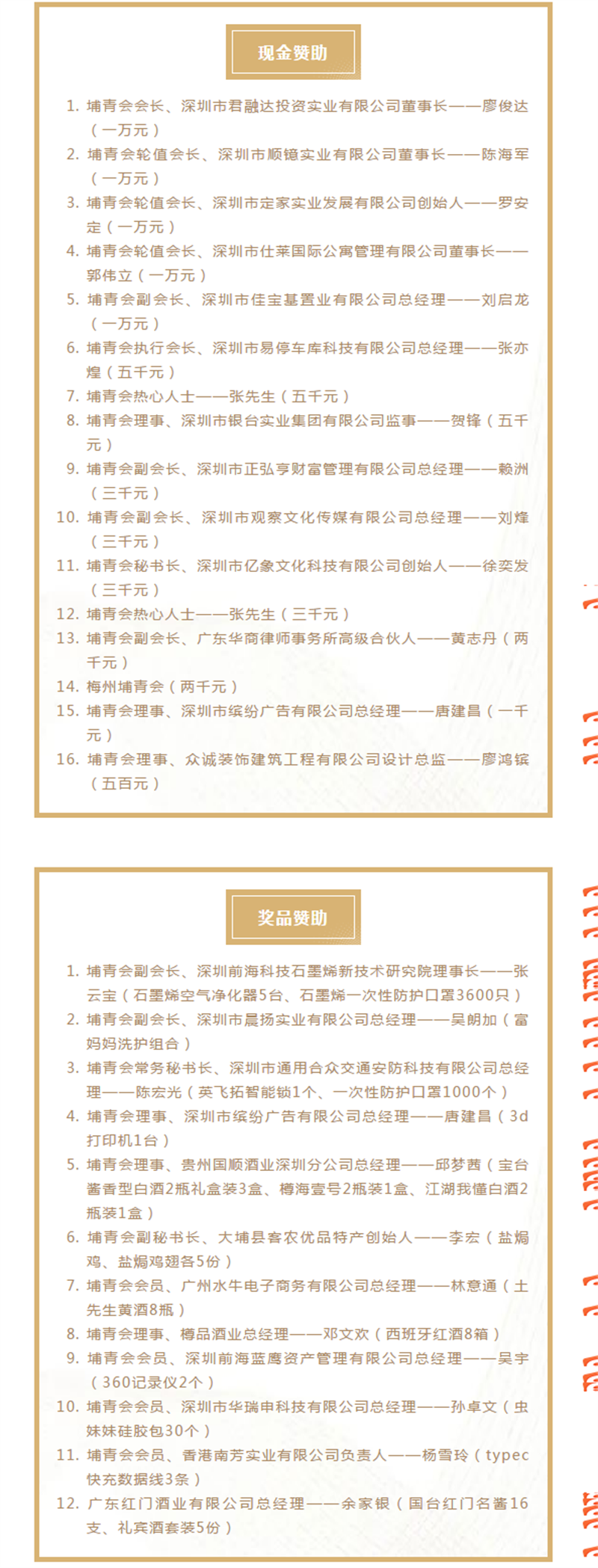 最后,特别鸣谢我们此次换届大会的赞助企业,此次大会所得的赞助款一半用于购买奖品用于活动抽奖,还有一半我们将用于回馈家乡,捐助给大埔福利院进行公益慈善事业。