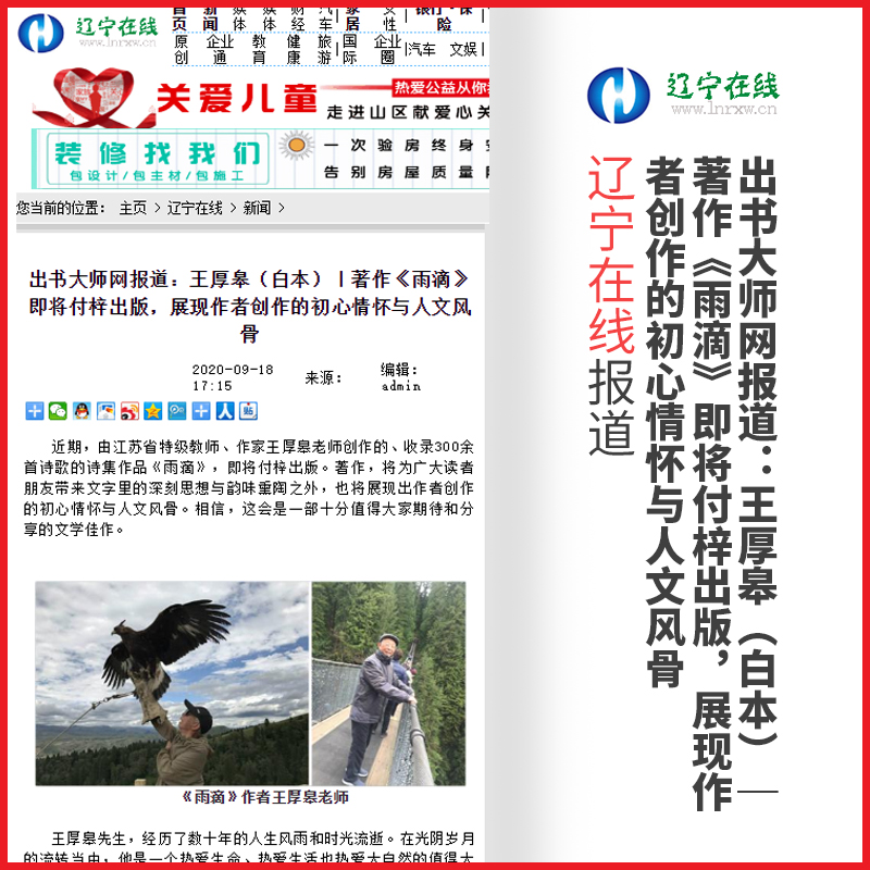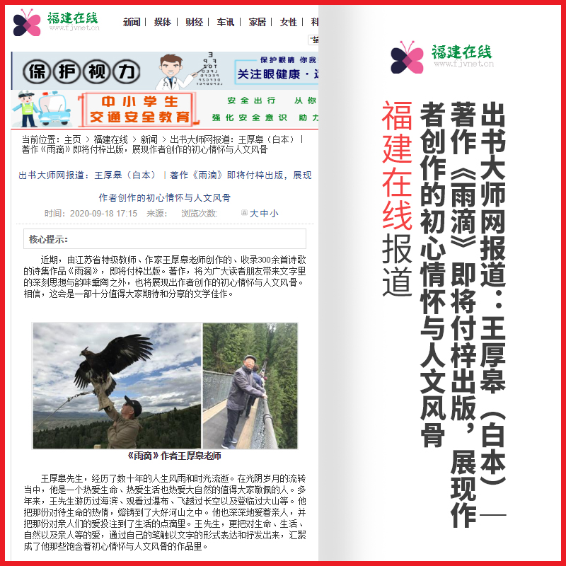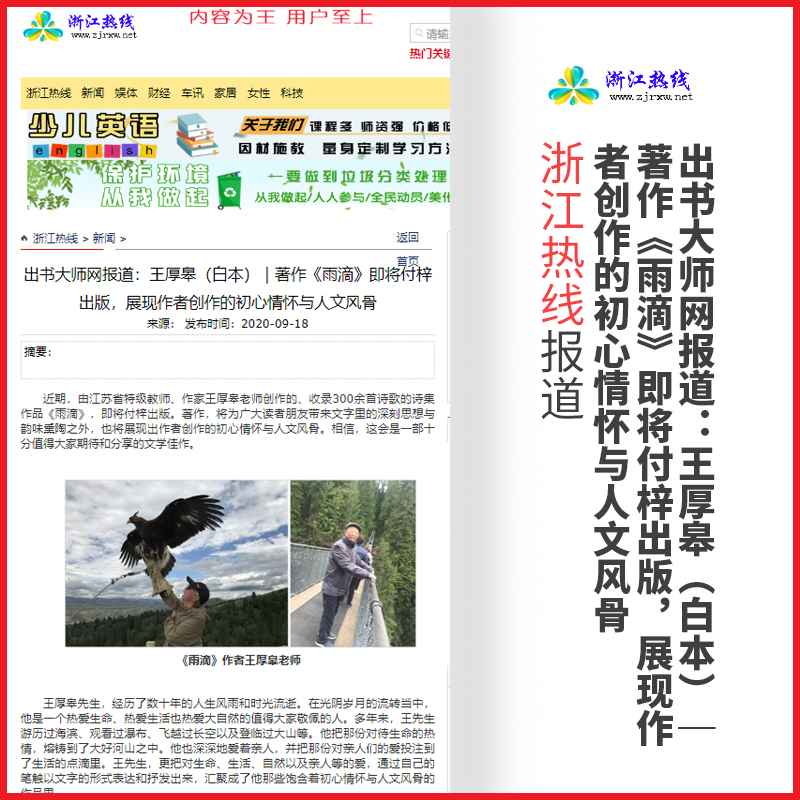 近期,由江苏省特级教师、作家王厚皋老师创作的、收录300余首诗歌的诗集作品《雨滴》,即将付梓出版。著作,将为广大读者朋友带来文字里的深刻思想与韵味熏陶之外,也将展现出作者创作的初心情怀与人文风骨。相信,这会是一部十分值得大家期待和分享的文学佳作。