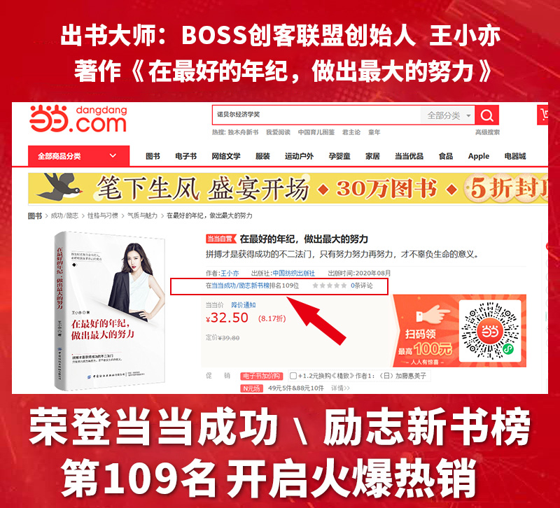 近日,由中国纺织出版社出版、出书大师网全权代理出版策划、王小亦老师创作的著作《在最好的年纪,做出最大的努力》喜获当当成功励志新书榜第109位,广受读者朋友的关注与欢迎!