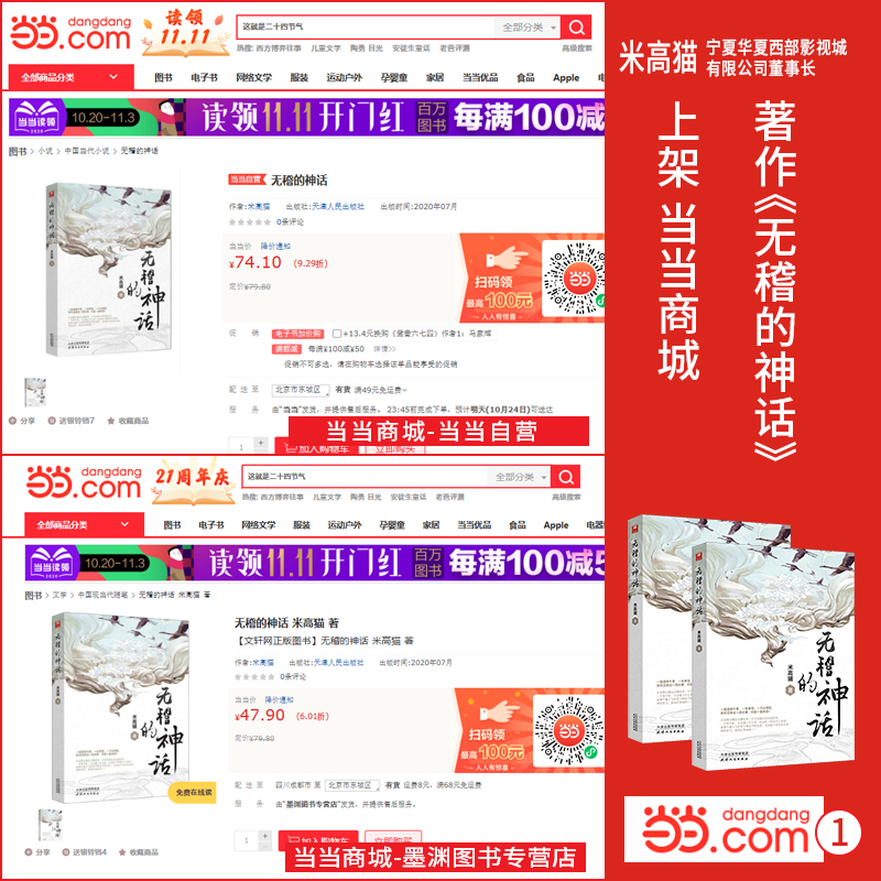 近日,宁夏华夏西部影视城有限公司董事长米高猫创作、出书大师网全权出版策划、天津人民出版社出版的著作《无稽的神话》,成功上架当当、京东等全渠道,开启了火爆热销。日前,图书作品受到了广大读者朋友的关注与认可。