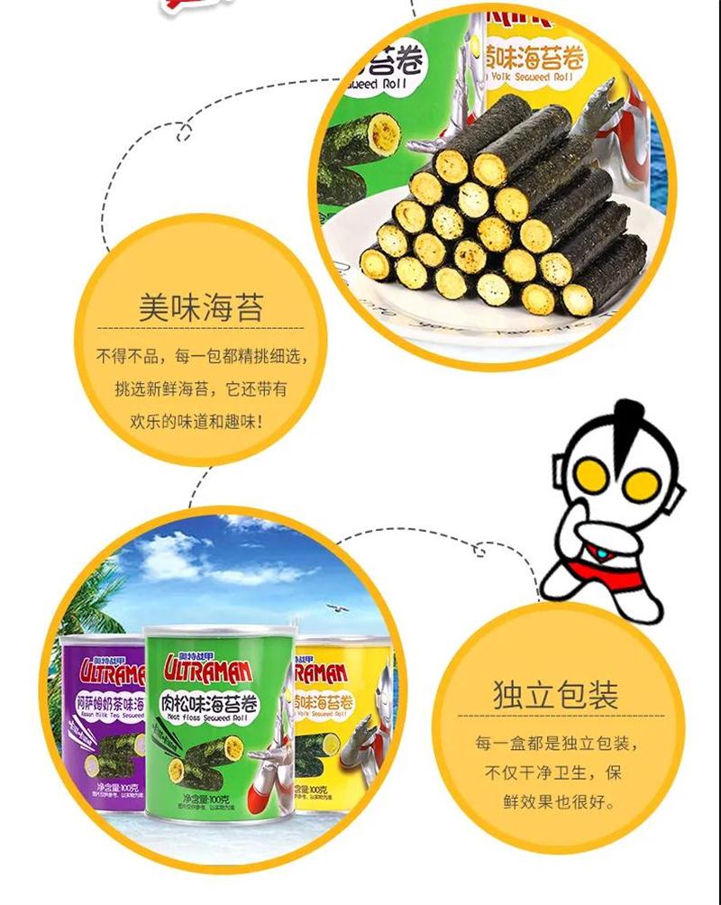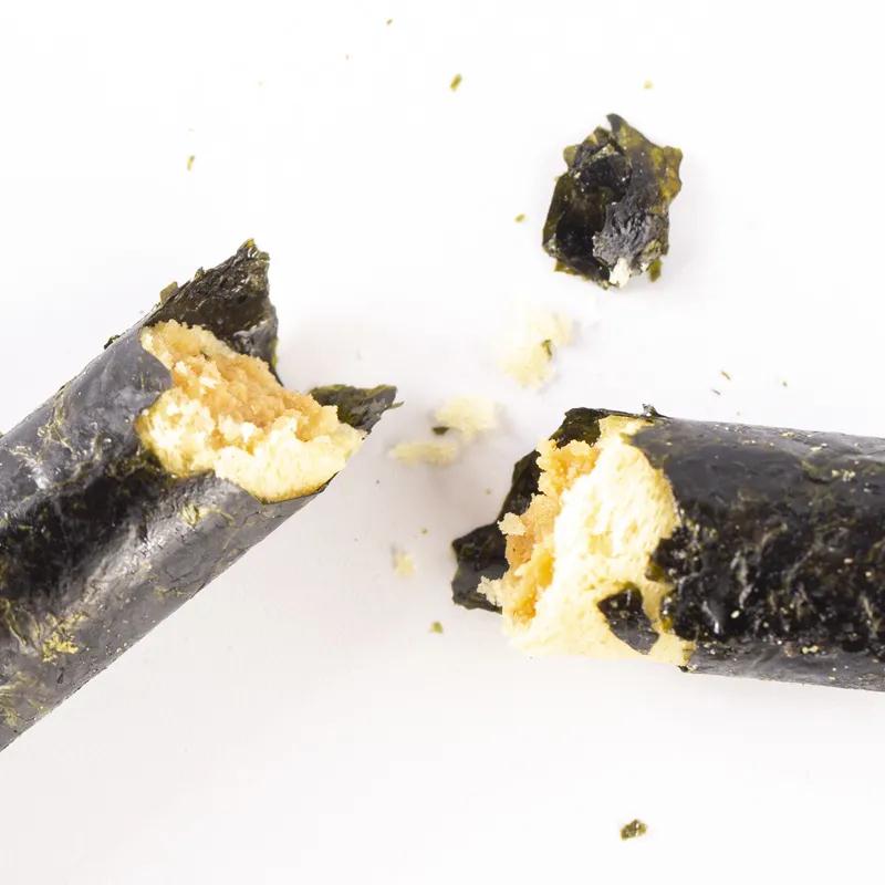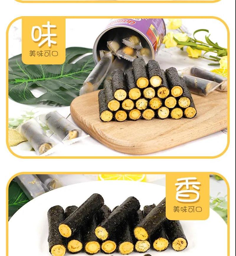 传统古法制作+现代先进的生产工艺相结合烘烤出来的海苔卷质地薄脆松香四溢不油腻卷曲烘烤工艺,锁住每一支的鲜香