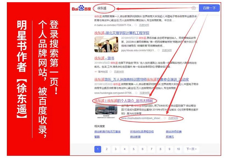 百度搜索作为国内最具影响力的搜索引擎,被它收录的个人或企业信息,往往具有广泛的被认可度和被传播度。可喜的是,徐东遥老师的个人品牌网站被百度收录并成功登录搜索页面首页,这极大地提升了徐东遥老师的品牌价值与魅力,形成超强个人IP实力,既宣传了品牌,又能够吸引大批流量与优质资源,从而扩大个人影响力。