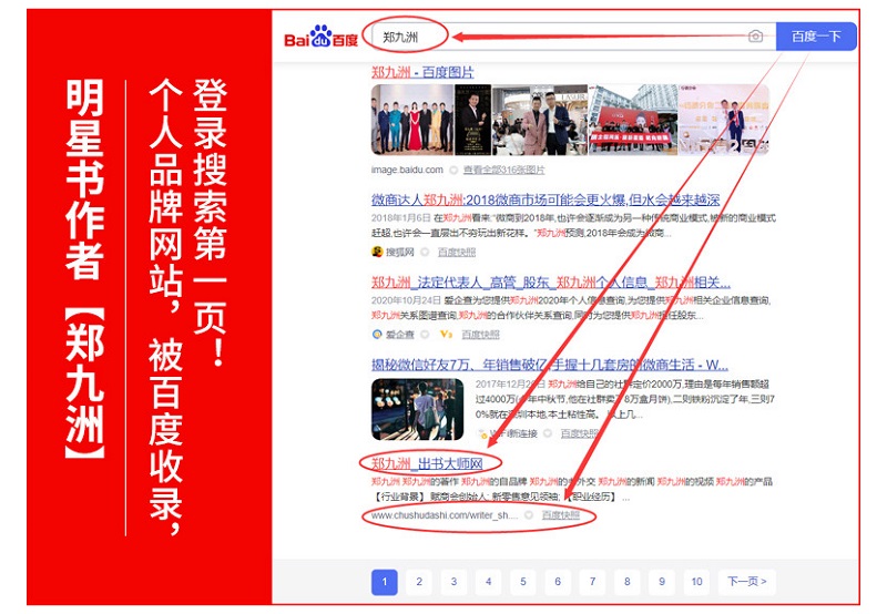 如今,郑九洲老师的个人品牌网站被百度收录,成功登录我国最大搜索引擎百度搜索首页,形成了专属于自己的个人流量IP。登上百度搜索首页就意味着巨大的流量和曝光率,随之而来是可观的社群红利空间,从而带来一系列的潜在社会影响力和价值感,其产生的效益无法用时间来衡量。对于打造个人自品牌来说,出书毫无疑问是一种十分有效的传播方式,通过出书能够迅速成为同行品牌竞争中的核心优势。
