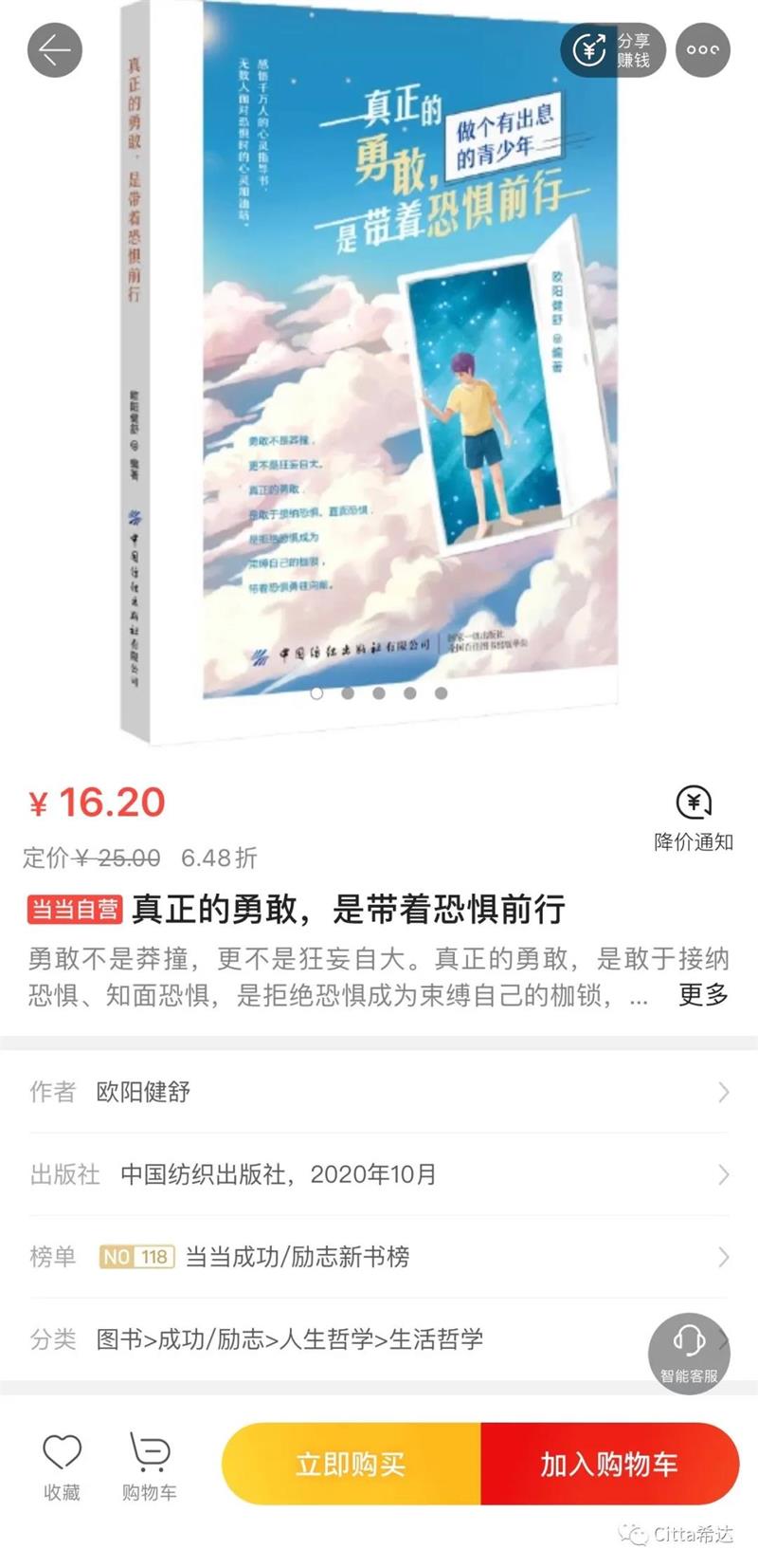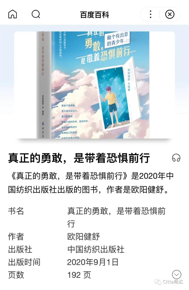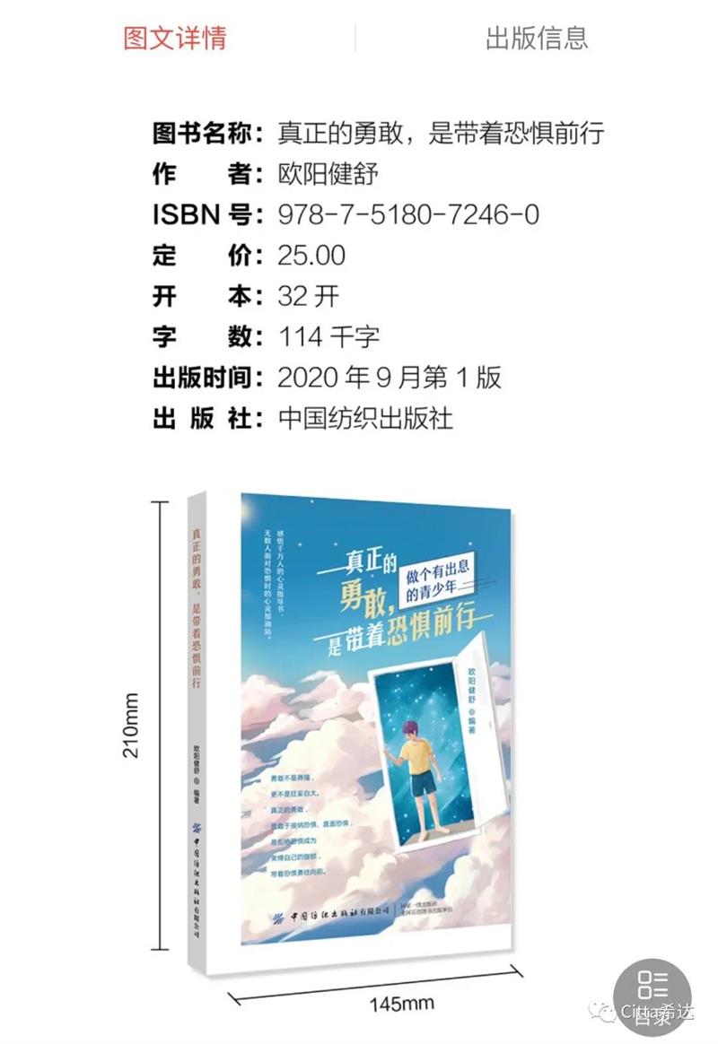 由希达工作室欧阳健舒老师独自完成的青少年的心理书籍《真正的勇敢,是带着恐惧前行》,由中国百佳出版社之一的中国纺织出版社出版发行。