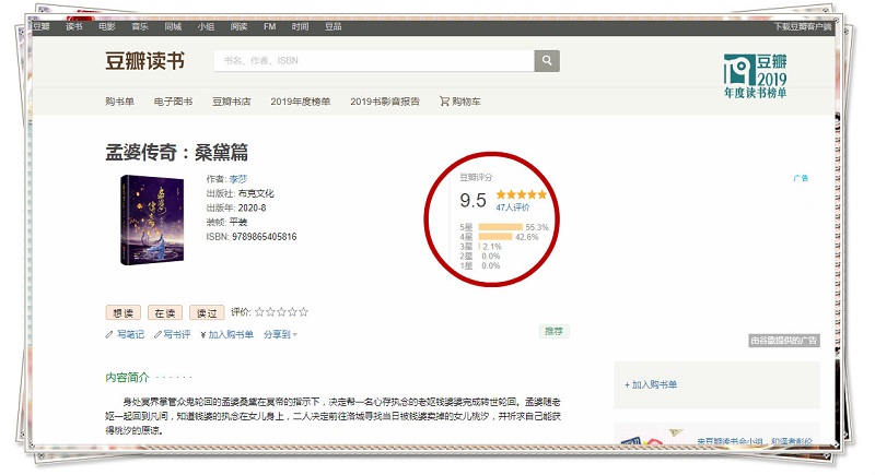 希达文化认为,李莎老师的著作《孟婆传奇:桑黛篇》获得了豆瓣读书9.5高分的好成绩,很好地说明了这本作品的受认可度和受欢迎度。而豆瓣读书作为国内别具影响力的图书平台,有着庞大的、高素质的读者群体,这里的读者往往具有一定的文学素养,他们在这里讨论、交流、互相推荐,俨然就是一个读书爱好者的聚集圣地。随着豆瓣读书平台的火热,很多读者在阅读之前往往都会在平台搜索书籍信息,书评和评分则成为是否阅读和购买的一大参考标准。