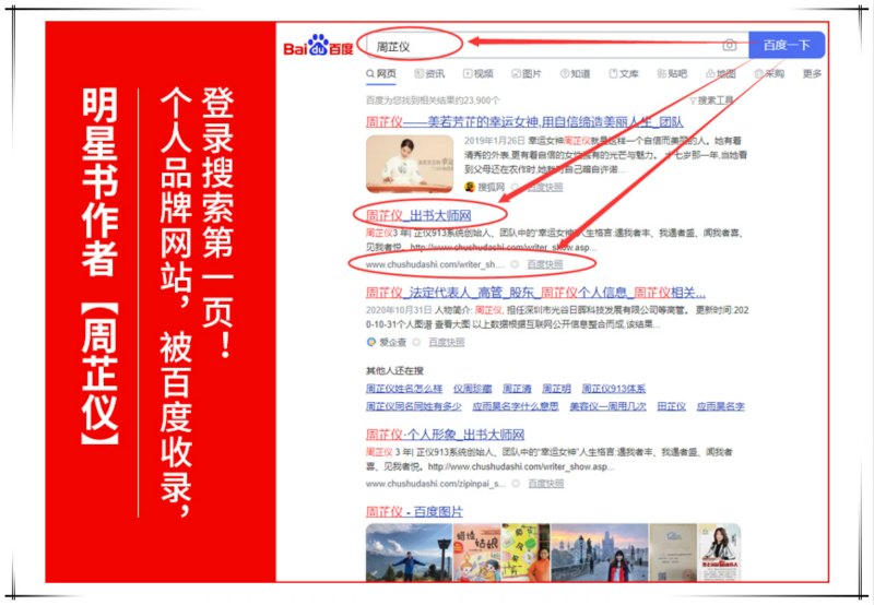 最近,出书大师网明星书作者、芷仪913系统创始人周芷仪老师的个人品牌网站正式被百度搜索收录,并成功登陆搜索页面的第一页,很好地对周老师的品牌价值进行了提升和优化。大家只需要打开百度搜索页面,在搜索框当中输入“周芷仪”这个关键词,然后,在搜索框的右侧点击搜索按钮,很快,关于周老师的相关信息便迅速地呈现在我们的眼前。而周芷仪老师的个人品牌网站信息,则出现在整个百度搜索页面第一页的顶部前列位置。这对于周老师的品牌价值提升,有着巨大的作用和效果。