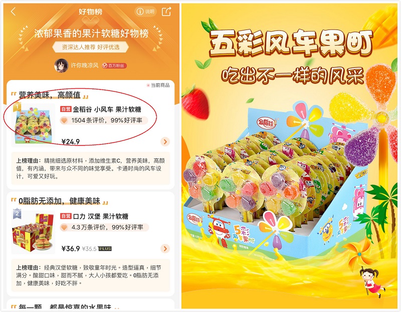 值得可喜的是,东莞市金旺食品有限公司的新品金稻谷风车棒棒糖,在众多传统糖果品牌中,犹如一匹黑马脱颖而出。进入天猫超市仅一个月的时间,就摘得糖果类最热门品牌桂冠!同时,在另外一家电商巨头京东的糖果类排行榜上,金稻谷与阿尔卑斯、徐福记、不二家等一起荣登销量TOP10榜单。