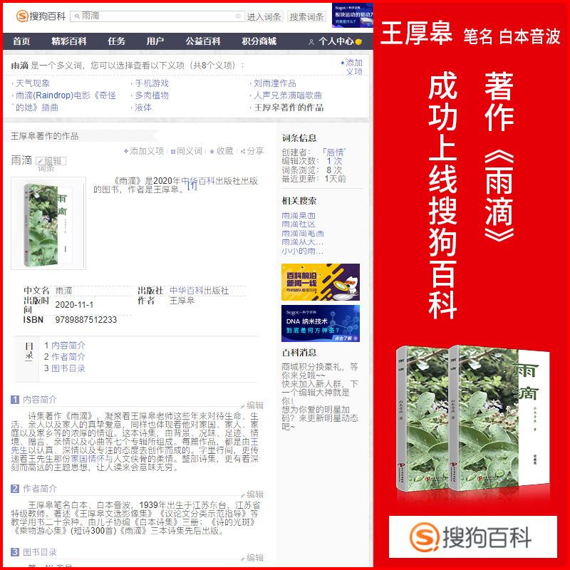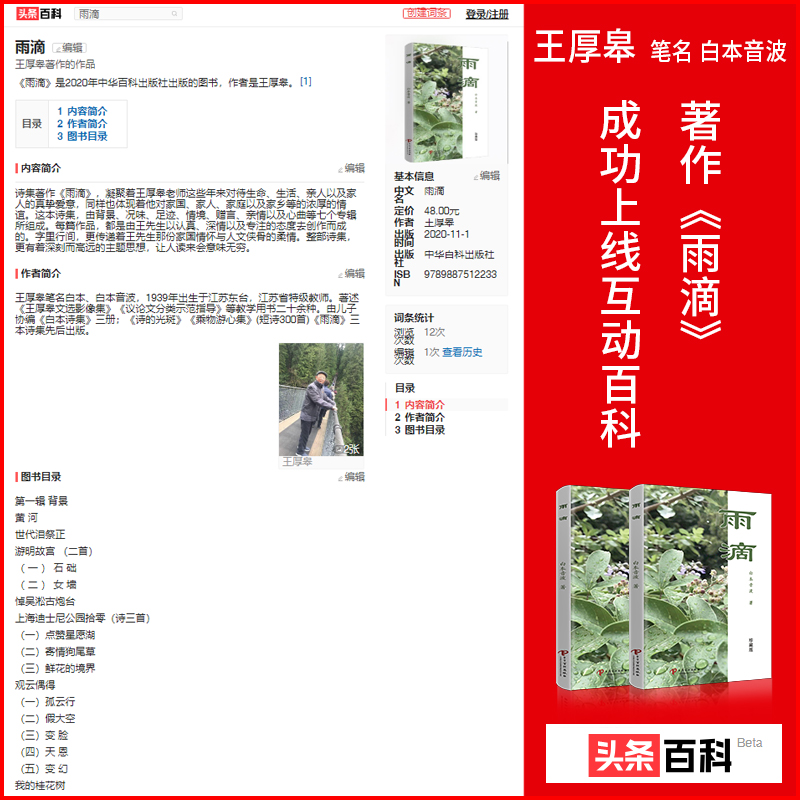 诗集《雨滴》正式上线百度、头条、搜狗等各大百科平台以及豆瓣读书,是王老师多年写作以及著作本身被机构和广大读者认可的一种证明,不仅体现了这本图书自身的权威性、被认可度、受欢迎度以及美誉度,而且更体现了图书作者王厚皋老师以及作品自身的实力。百度、头条以及搜狗等百科平台,作为国内极具权威性和可靠性的百科全书词条平台,对于诗集《雨滴》的上线,是有着非常巨大的品牌传播效应的。而豆瓣读书作为国内领先的读书社区,聚集着广泛的高素质的读者群体。诗集《雨滴》上线豆瓣读书,更是在众多高素质读者当中建立了广泛的作者个人价值权威认可。